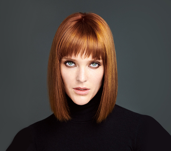 Комбинация неградуированного классического каре и градуированной челки. Контраст яркой плотной длины и облегченной челки придает стрижке харизму.